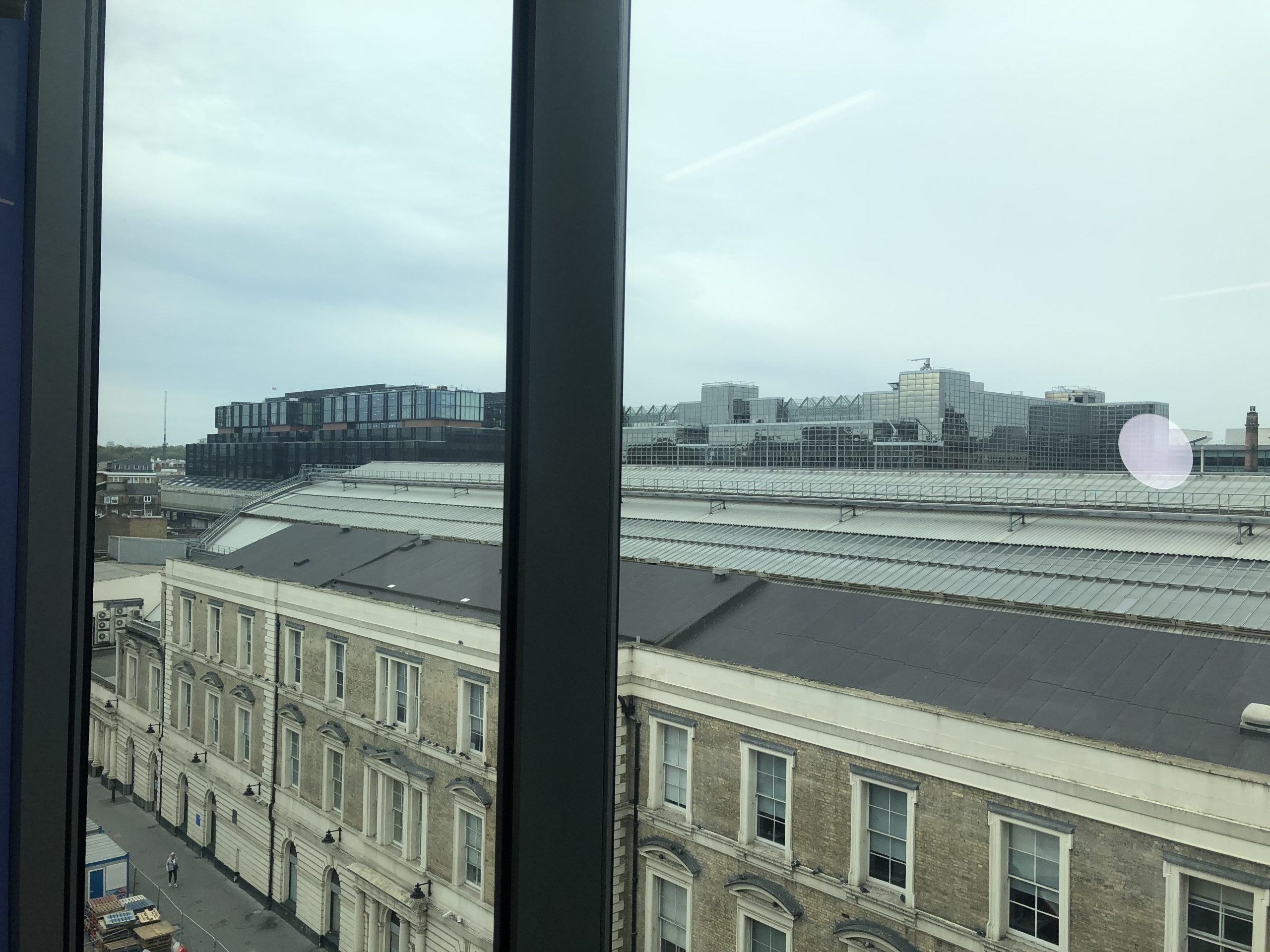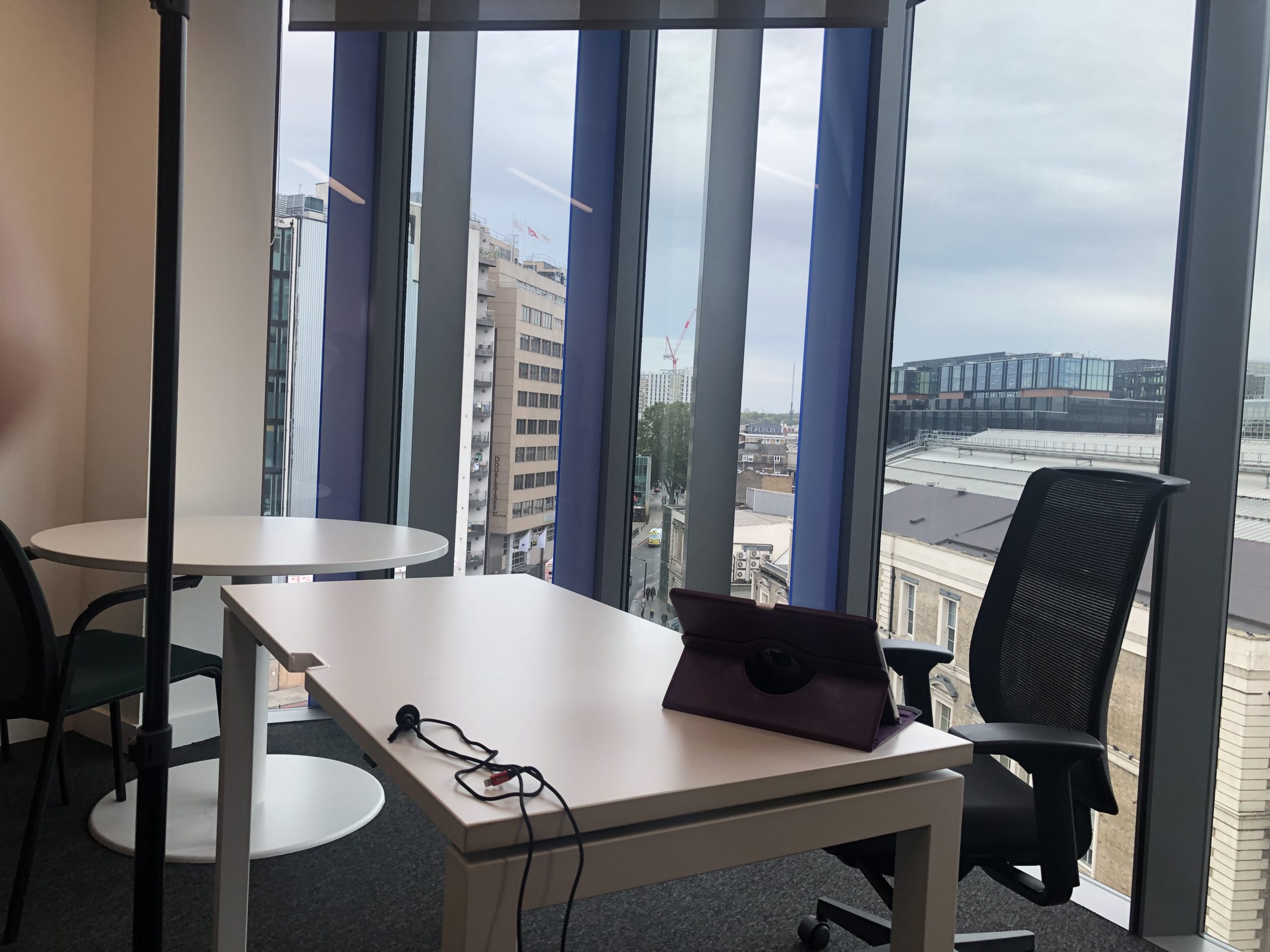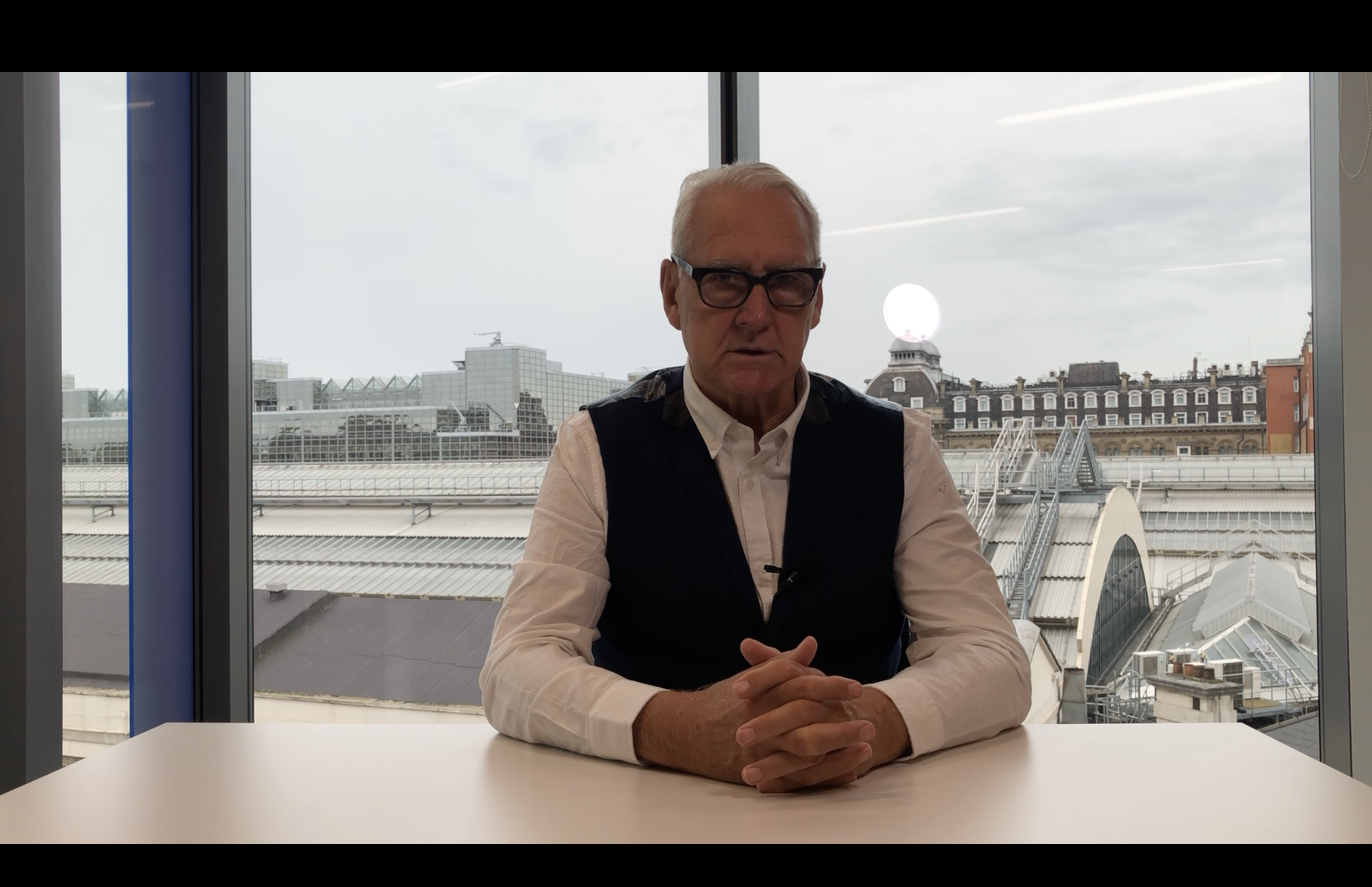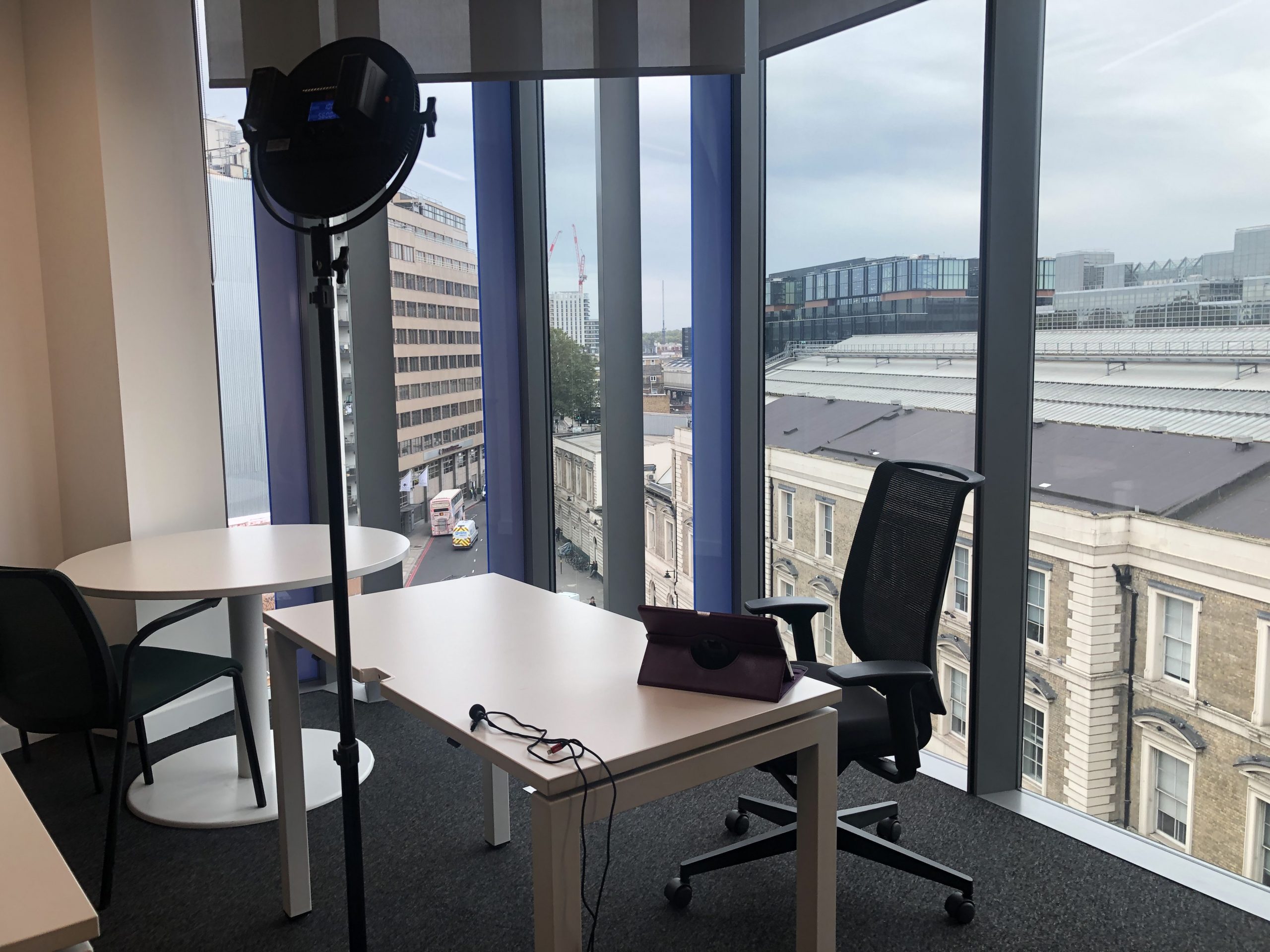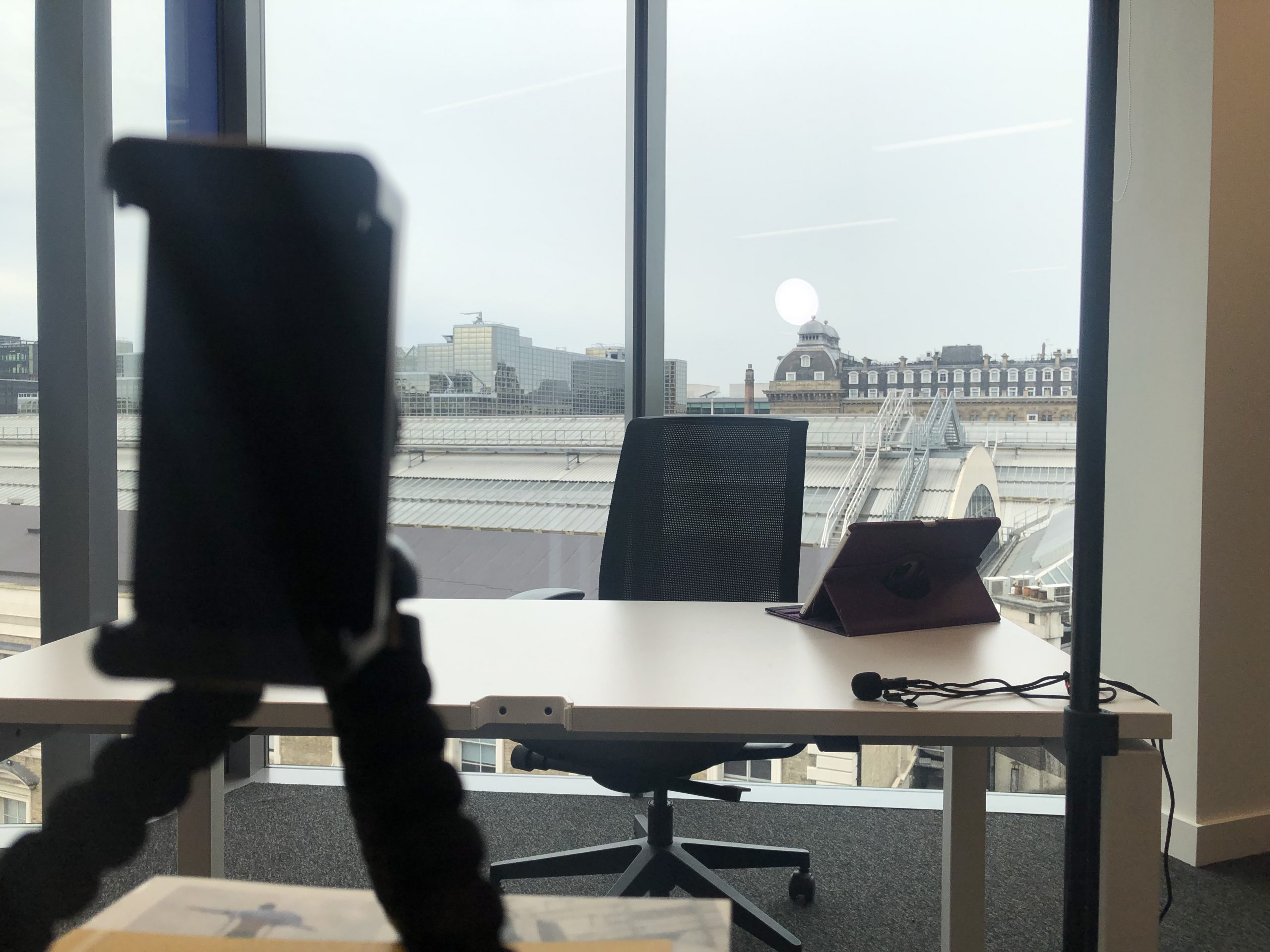The client, Chris Davies, wanted to shoot against the window with a view over the London Victoria. However, this led to a bit of trouble with the lighting, as we were unable to control the room light. Having natural light coming in from behind risks overexposing the shot, or even under-developing it with too many shadows, and this definitely became a problem with how the natural light changed and moved throughout the two and a half hour recording session. This issue also meant trouble with the LED light as no matter how much I moved and played with it, the shot felt like it was not changing or improving. Despite panic levels rising, everything surprisingly worked out after recording some test videos and the image was completely perfect aside from a small reflection from the LED light that I would have to edit out in post.